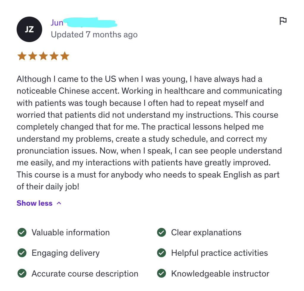Because of this, this course is helpful for those who have never worked on their pronunciation before, as well as those who have. For those just starting to improve their pronunciation, this course will take them step by step from the basics to more advanced topics. Whereas if you’ve worked on your pronunciation before, or take my 1-on-1 live training, this course will be a helpful resource for every single sound.