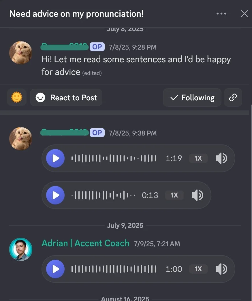 I’ve seen talented professionals stall as they relied random tips, unfocused practice, and inconsistent. I created this mentorship program to change that. This guided program gives you a solid foundational structure but is tailored to your specific goals. Whatever you need help with—vowels, consonants, rhythm, intonation, or connected speech—I’ve got material on that, and will make more if need be!